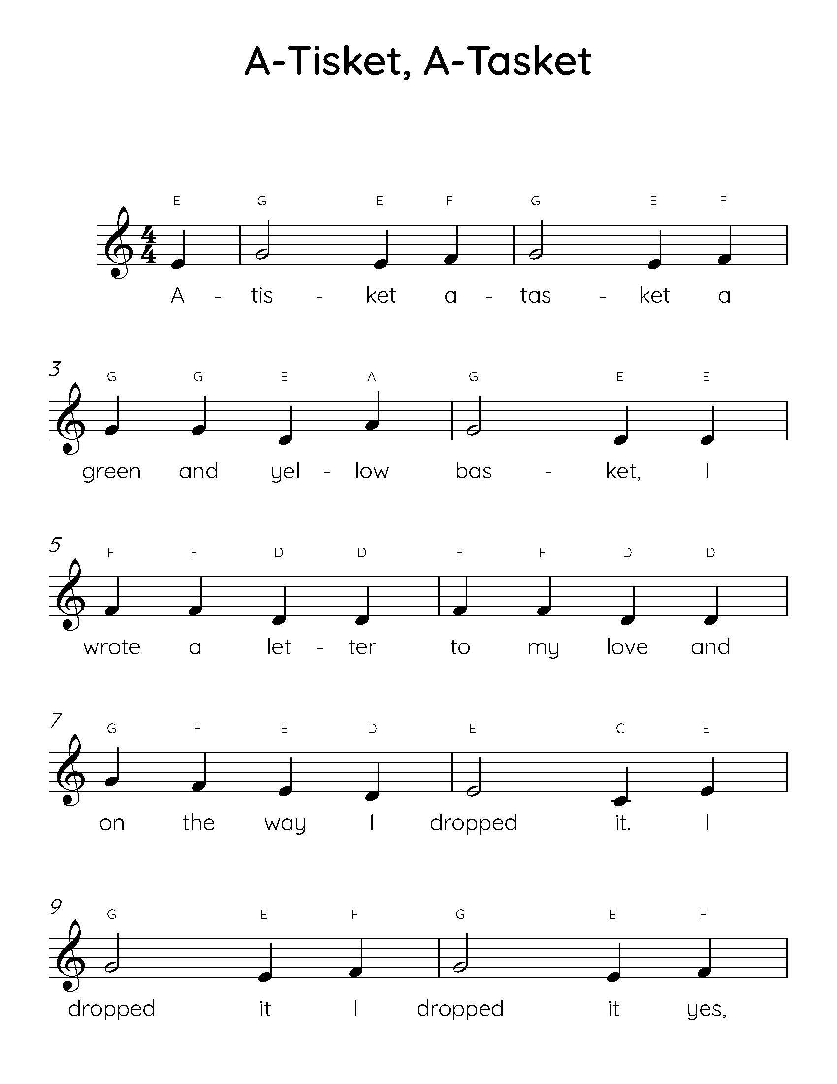 A-Tisket A-Tasket easy piano sheet music is perfect for people of all ages who are learning to play piano or keyboard. This arrangement is also a great resource for piano teachers who are looking for easy piano music to teach their students.