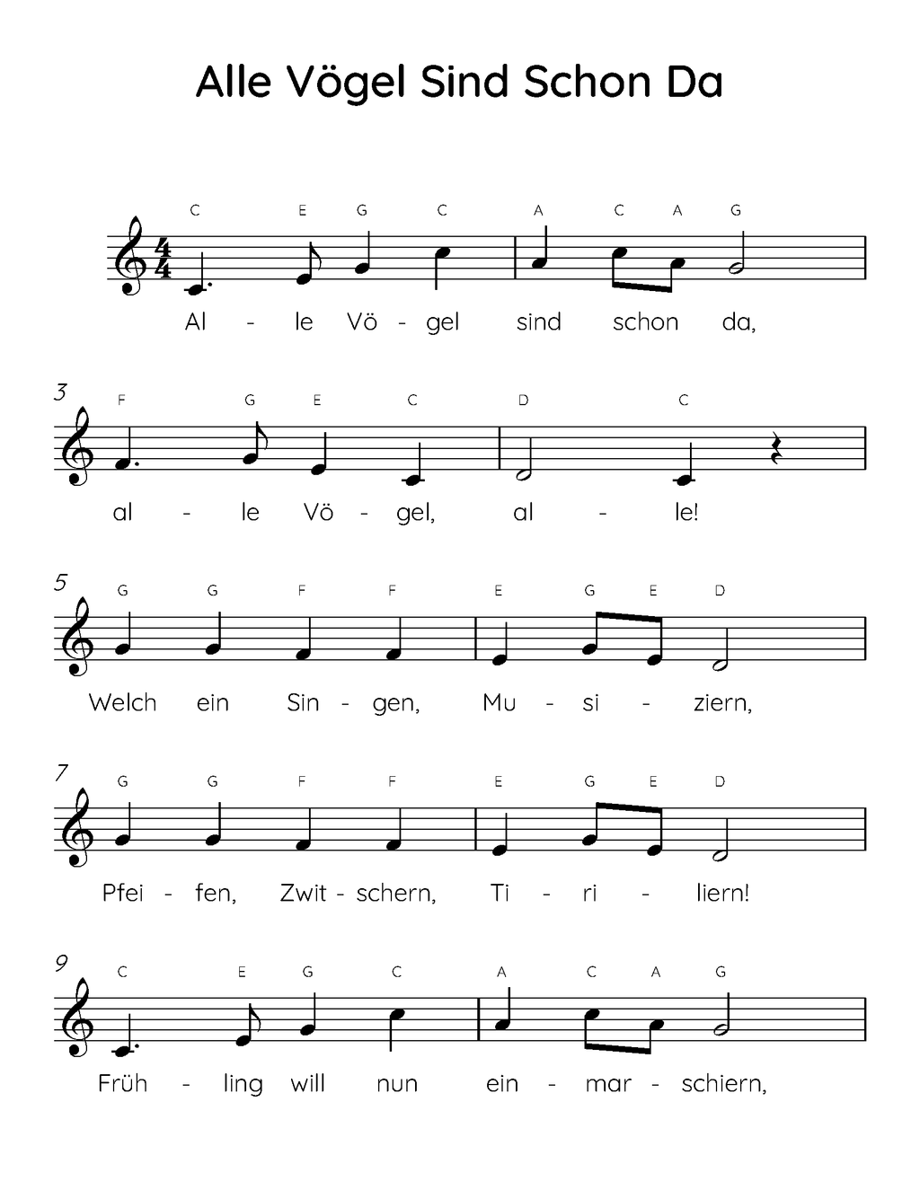 Alle Vogel Sind Schon Da Easy Piano Sheet Music